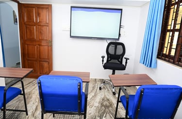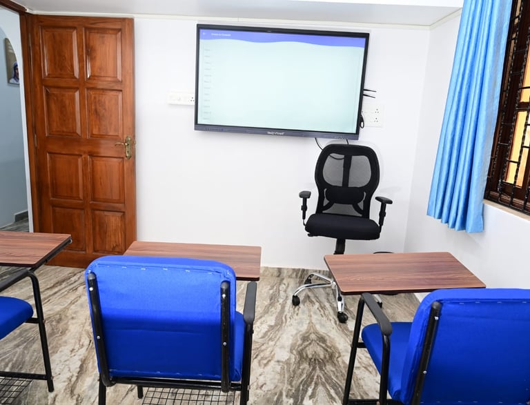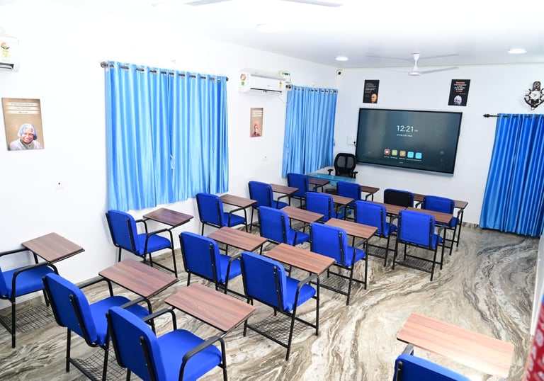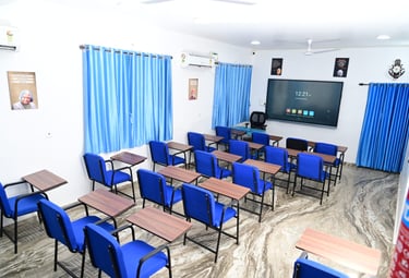 Fully AC rooms, smart TVs, comfy seating, pure aqua water, CCTV, and fingerprint attendance.